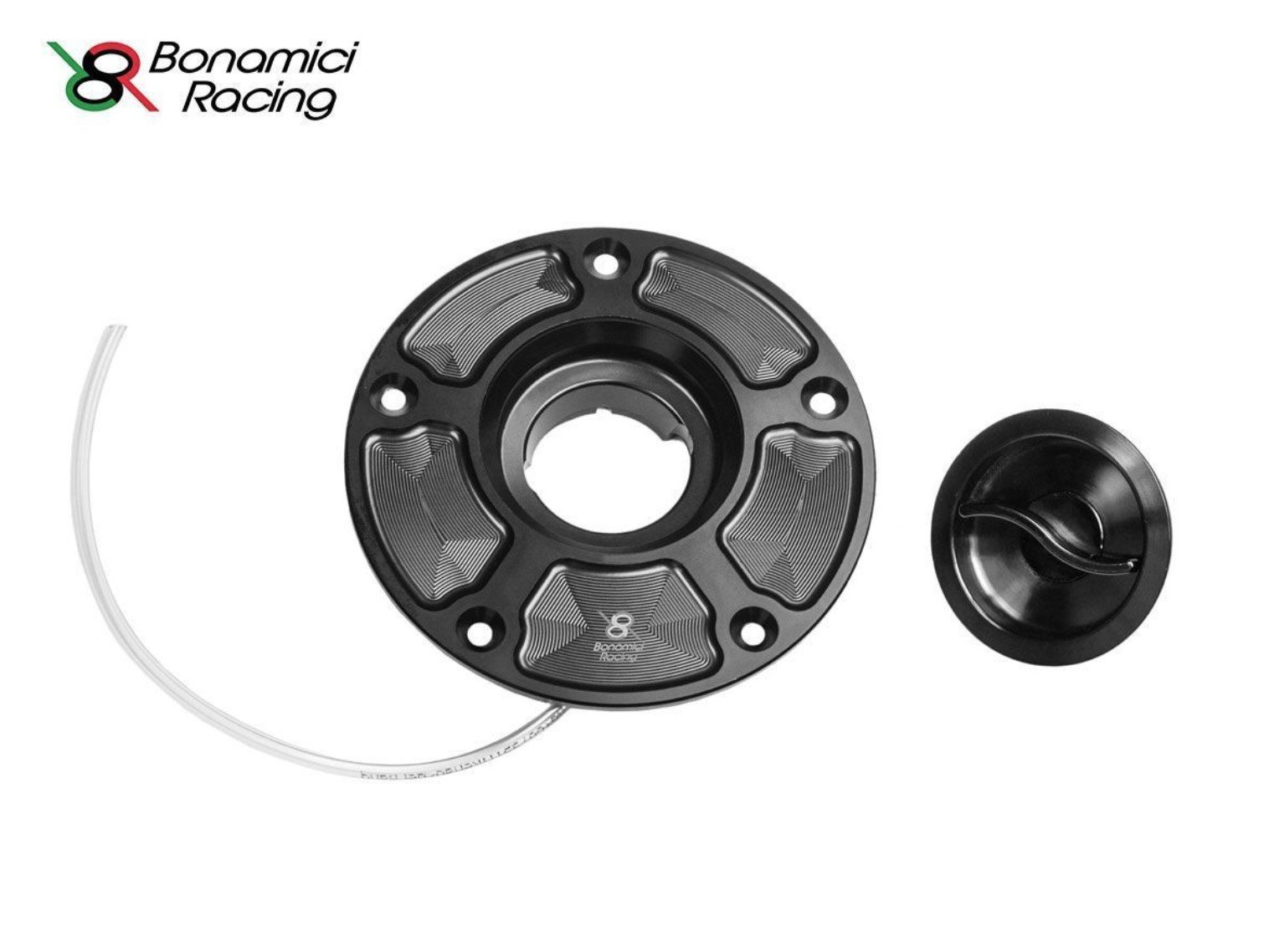 Bonamici Racing tank cap completely in billet aluminum with subsequent surface anodization. The quick-closing cap will allow faster refueling without using the ignition key. Simple to install and requires no modification for correct assembly.