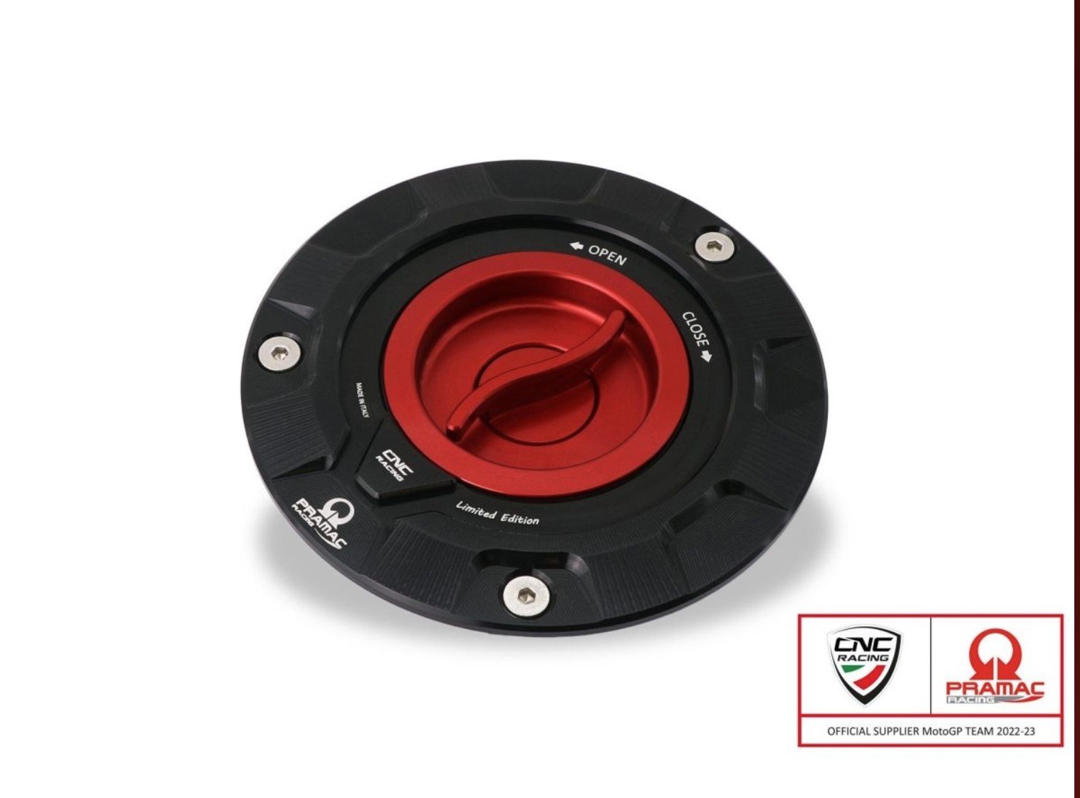 Fuel tank cap for Ducati Pramac Racing Limited Edition, made of billet aluminum and subsequent surface anodization.Ā The cap in this configuration is supplied with a Fast Open racing closure.Ā The internal shell is made of ergal with hard anodization which guarantees a scratch-free surface finish even after continuous contact with the gun when refueling.