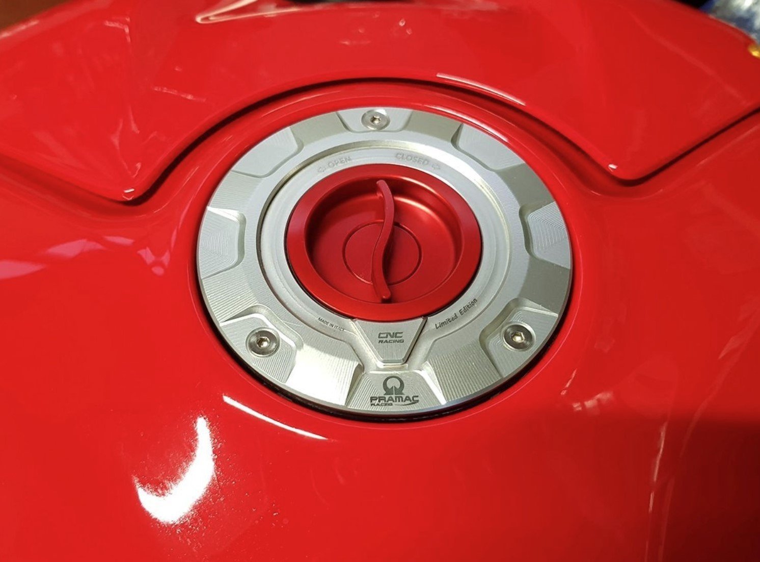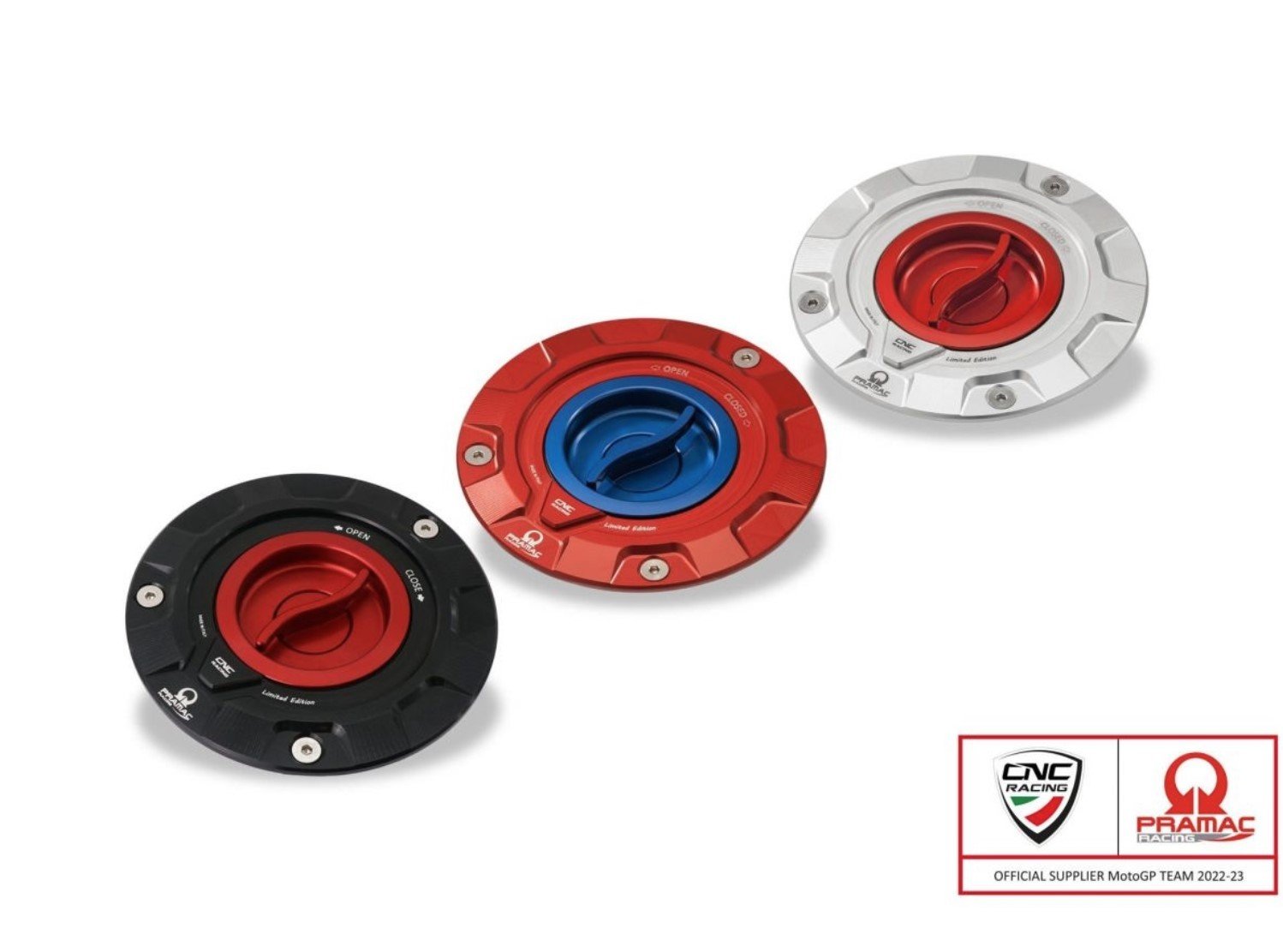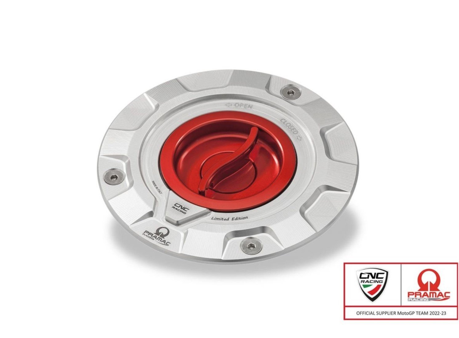 Fuel tank cap for Ducati Pramac Racing Limited Edition, made of billet aluminum and subsequent surface anodization.Ā The cap in this configuration is supplied with a Fast Open racing closure.Ā The internal shell is made of ergal with hard anodization which guarantees a scratch-free surface finish even after continuous contact with the gun when refueling.