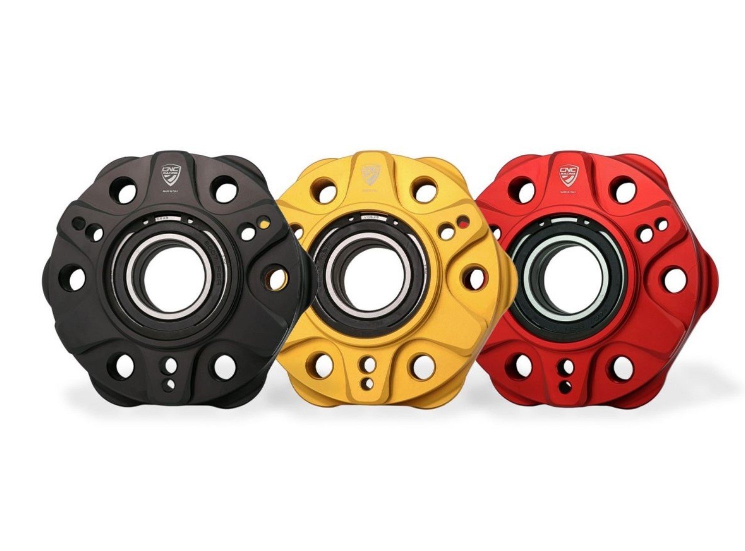Sprocket holder flange machined from solid light alloy with subsequent colored anodizing surface treatment.Ā The product is supplied with new bearings and bushings already mounted for quick and easy replacement of the original hub.