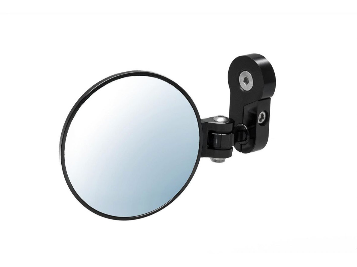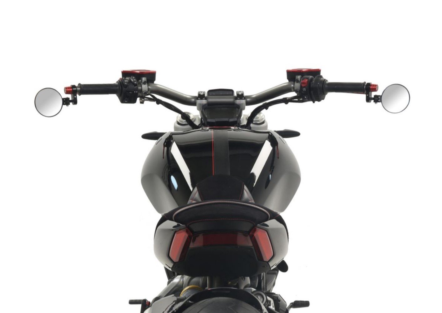 Bar-end mirror, machined from light alloy billet and then given an anodized surface finish. The useful area extends on an 81mm diameter, to ensure the best possible visibility. The mirror can be fitted in either low or high position and is compatible with most handlebars, both original and non, with an expansion assembly system (handlebar internal diameter Ø 13.5/19 mm) or with a M6 screw, included in the package. It is suggested to purchase our Brembo master cylinder clamp CV001.