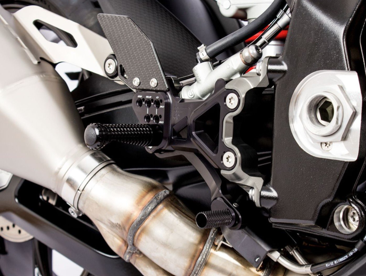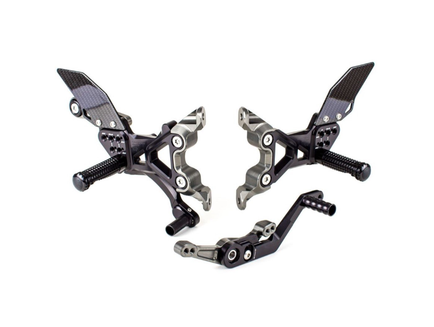 Gilles Tooling rear sets deriving directly from the world of SBK.Ā With a slim profile Racing system that faithfully follow the entire contour of the frame.Ā With the footrests you will get a good closure of the knees and legs during the entry, the distance and the exit of the curve.Ā The footpegs are rigid with a high level of grip for the best possible grip.Ā The Gilles Tooling footpegs also offer the possibility of reversing the gearbox in order to provide a unique customization for each riding style.Ā Adjustable up to 6 positions, including the original “0” position, in such a way as to provide the rider with a unique personalization of its kind.Ā Finally, the shift platform can be adjusted to the Racing position where the travel is reduced to speed up the gear change.