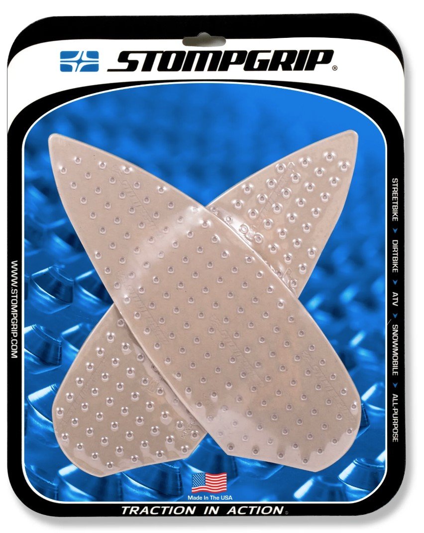 Pre-formed stickers for all road and off-road motorcycles that improve grip on the tank, helping the body in both braking and cornering situations, without damaging the graphics of the bike that remain, in the transparent version, however visible. Stompgrip anti-slip grips are used by the best MotoGP and Superbike teams.