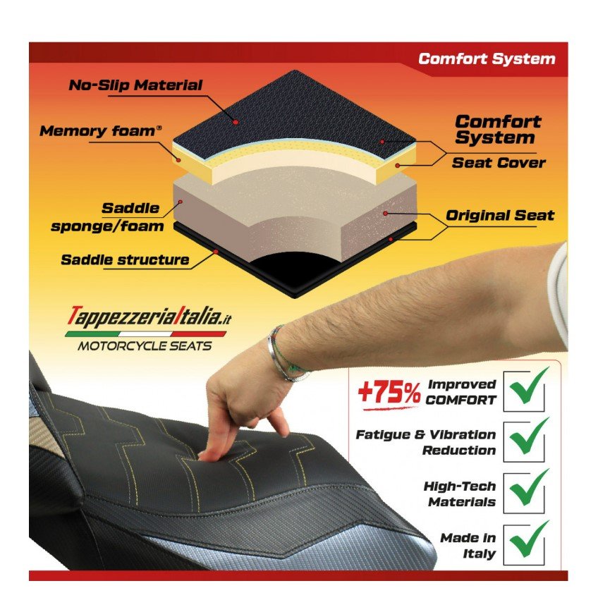 This cover is combined on the inside with a special memory foamĀ latex sponge, which gives more comfort to the saddle.Ā Waterproof* and resistant at atmospheric agents.Ā Reinforced with double stitching,Ā high resistance to chemical agents.Ā We deliver the detailedĀ instructions manual for assembly.Ā However, we recommend installationĀ by qualified personnel.
